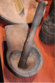 佤族以大米為主食。西盟地區(qū)的佤族都喜歡把菜、鹽、米一鍋煮成較稠的爛飯。其他地區(qū)的佤族則多吃干飯。農忙時日食三餐,平時吃二餐。雞肉粥如茶花稀飯是家常食品的上品。旱稻多現(xiàn)吃現(xiàn)舂,男女老幼皆食辣椒,民間有“無辣子吃不飽”之說。副食是青菜類、瓜類、酸竹筍、鹽、辣椒、蔥、蒜等。肉食主要是牛、豬、雞、狗以及獵獲的獸、禽、松鼠、田鼠、魚、螺螄、螃蟹、蜂兒等。一些地區(qū)的佤族還有捕食昆蟲的習慣,更食用蛹、寄生于草木植物的紅毛蟲、掃把蟲和寄生于冬瓜樹的冬瓜蟲等十余種。一般是把可食的昆蟲與米一起煮成粥,加菜、鹽、拌辣椒,香辣可口(兩圖為舂米和舂米用具,劉軍攝影)。