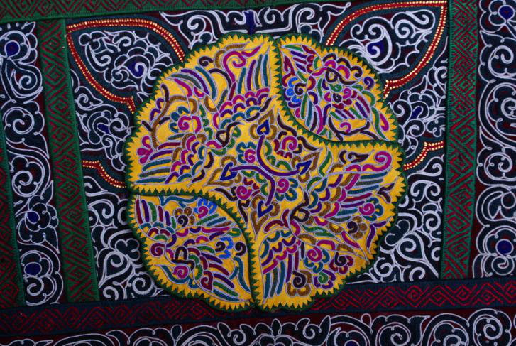 水族有養(yǎng)馬賽馬習(xí)俗,馬尾繡應(yīng)運(yùn)而生。以絲線裹馬尾刺繡制作圖案的好處是馬尾質(zhì)地較硬,能使圖案不易變形,馬尾不易腐敗變質(zhì),經(jīng)久耐用;還有馬尾上含有油脂成分,利于保養(yǎng)外圍絲線光澤;另一奇特之處就是繡品上綴有形如古代錢幣的銅飾,以紅線穿貼于馬尾繡片里,如星星點(diǎn)點(diǎn)的小花,除了做裝飾外,水族同胞認(rèn)為,銅有驅(qū)邪避兇的功能。在封建社會(huì),銅是鑄幣之物,一些朝代嚴(yán)禁民間鑄銅,馬尾繡里卻繡有銅飾,這充分體現(xiàn)了水族馬尾繡的珍貴文化藝術(shù)價(jià)值。