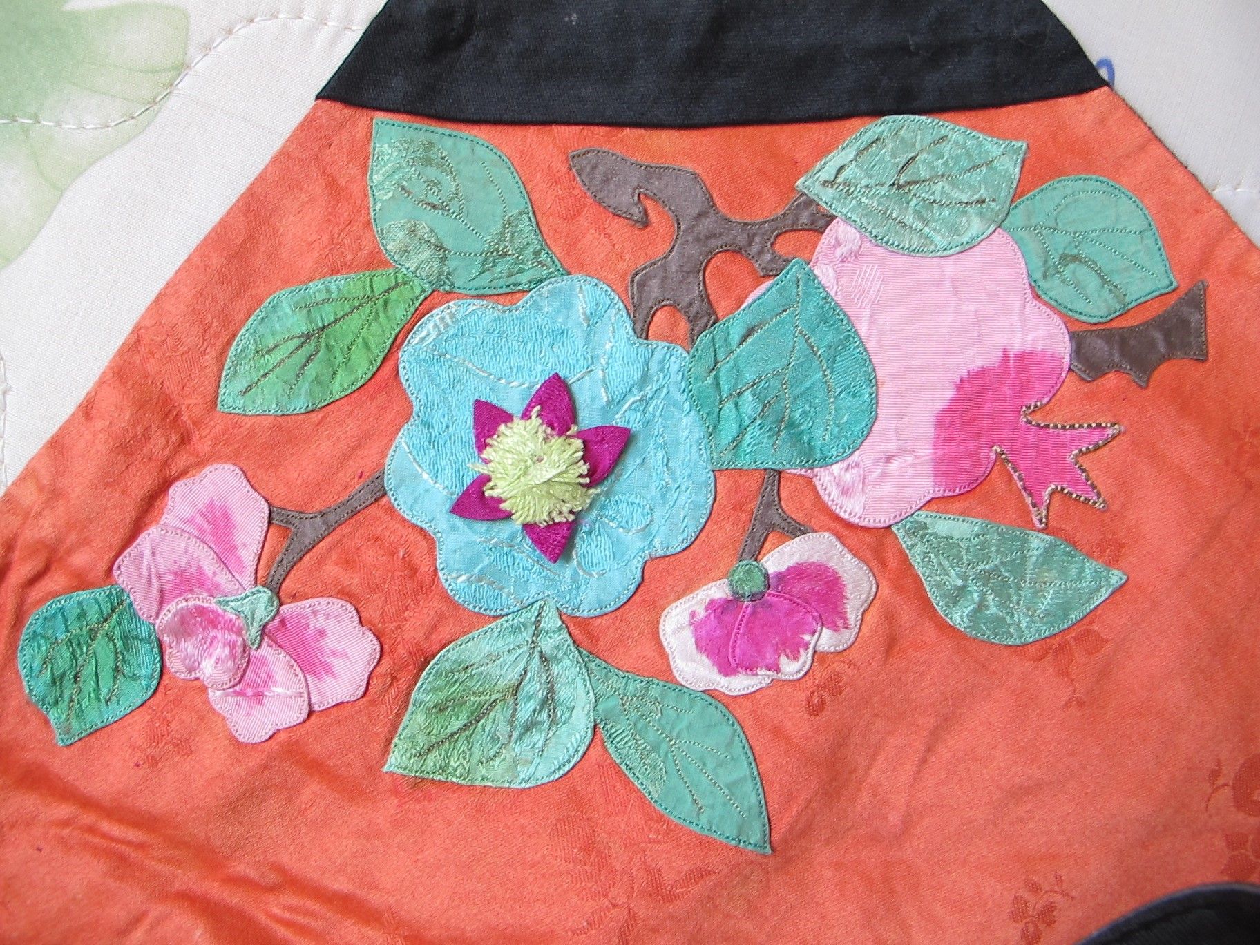 第四步是刺繡。機(jī)繡作品雖然操作簡便,速度快,工作效率高,但由于不能隨時調(diào)換粗細(xì)不同的機(jī)針或不同顏色的機(jī)線,圖案比較簡單,繡法也不能象手工繡那樣靈活多變,所以東鄉(xiāng)族婦女對能充分施展本領(lǐng)的手工繡情有獨(dú)鐘。