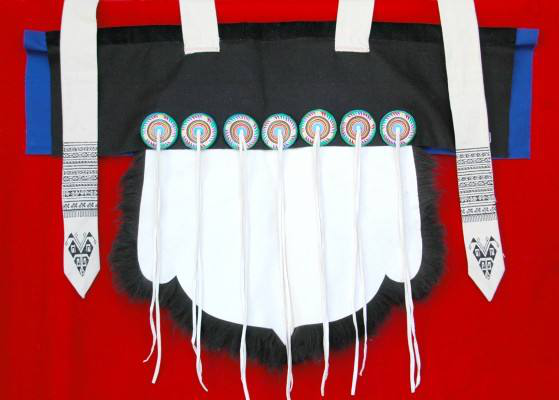 七星披肩所用材料為黑色綿羊皮,先將羊皮去毛、洗凈、硝白、縫成披肩,然后在披肩背上繡上自己縫制精美的七顆星星,每個(gè)星星中心垂下兩條布帶,整個(gè)布帶與白色寬帶相繞,帶梢端垂于后,披肩的兩角釘上兩條白布帶,勞動(dòng)時(shí)拉到胸前交叉系緊。”這樣一件精美的“披星戴月衣”是對(duì)勤勞的納西族婦女的歌頌,形如蛙身狀的披肩是古代納西族圖騰崇拜的標(biāo)志,在納西族傳統(tǒng)中,青蛙是智慧之神,反映了納西族在美學(xué)、習(xí)俗等方面形成的傳統(tǒng)觀念和心理特征。