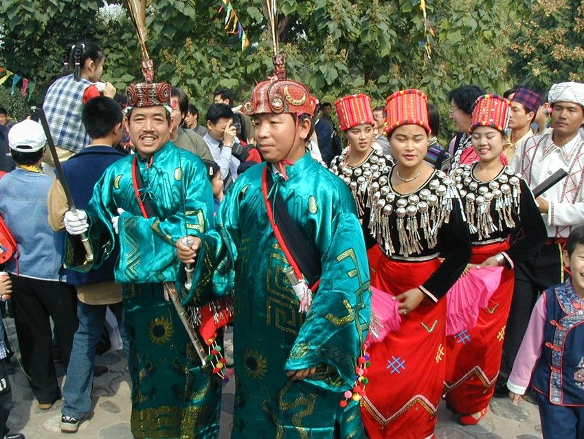 目瑙節(jié):又稱“總戈”,景頗語音譯,意思是“大伙跳舞”。目瑙節(jié)是景頗族最盛大的傳統(tǒng)節(jié)日,一般于每年農(nóng)歷正月十五以后的九天內(nèi)擇雙日舉行,節(jié)期三至五天不等。目瑙作為一種大型的群眾性歌舞活動(dòng),由來已久,歷史上,每逢豐年,出征、凱旋、婚姻嫁娶、敬祭鬼神等重要活動(dòng),均要跳“目瑙”。景頗族的“目瑙縱歌”原來是一種融宗教和文化習(xí)俗為一體的傳統(tǒng)慶典。隨著社會(huì)的發(fā)展,逐漸演化為各種不同類別的“目瑙”。大致有以下幾種:①“歲目瑙”,家庭財(cái)源茂盛,人丁興旺時(shí)舉行;②“布當(dāng)目瑙”,征戰(zhàn)取得勝利時(shí)舉行;③“貢冉目瑙”,同胞兄弟分家自立門戶時(shí)舉行;④“騰肯目瑙”,新建房屋住所落成時(shí)舉行;⑤“空然目瑙”貴族家娶親辦婚禮時(shí)舉行;⑥“達(dá)如目瑙”,出征時(shí)舉行;⑦“昔目瑙”,有名望的長(zhǎng)者去世送葬時(shí)舉行;⑧“柱目瑙”,祭奠“木代”神時(shí)舉行。不同類別的“目瑙”都有特定的內(nèi)容和表現(xiàn)形式,但有一個(gè)共同點(diǎn)就是整個(gè)過程都是由“瑙雙”(領(lǐng)舞)隊(duì)和“瑙巴”(表演)隊(duì)組成的舞隊(duì)來表現(xiàn)和完成的。每逢目瑙節(jié)日,村村寨寨的景頗人身著節(jié)日盛裝,紛紛從四面八方涌入目瑙廣場(chǎng)。廣場(chǎng)上人山人海,氣氛熱烈歡快而不失莊嚴(yán)古樸的特色。廣場(chǎng)中央高豎著四根長(zhǎng)約4米的目瑙柱,亦稱雌雄柱,中間兩根為陰,外面兩根為陽,上面皆繪有精美而富有象征意義的圖案:右邊柱上往往繪以蕨菜花紋,象征團(tuán)結(jié)奮進(jìn);左邊常畫回紋構(gòu)成若干個(gè)四方形,并涂以不同顏色,表示景頗族的遷徙路線;中間兩根柱子之間,交叉著兩把長(zhǎng)刀,為景頗民族驍勇強(qiáng)悍、堅(jiān)強(qiáng)剛毅性格的具體標(biāo)志。目瑙柱的左側(cè)立著一個(gè)方形架子,上層是吹嗩吶的座位;前面掛著一個(gè)兩米長(zhǎng)的大皮鼓和一面直徑一米多的大芒鑼,供跳舞時(shí)伴奏用。廣場(chǎng)四周用竹籬笆圍起,目的是為了防止野鬼的侵入和牲畜的干擾。舞蹈開始時(shí),鼓樂齊鳴,由兩位德高望重且又熟悉目瑙舞路線的老人身穿大龍袍,頭戴飾有孔雀、野雞羽毛和野豬牙齒的目腦帽,手持長(zhǎng)刀領(lǐng)頭,后面跟著背銅炮和持長(zhǎng)刀的隊(duì)伍,婦女們拿著扇子或彩帕跟在最后,邊歌邊舞,熱鬧非凡。參舞者少則百多人,多則幾千人,從清晨到日暮,以日暮到清晨,通宵達(dá)旦,其間舞者跳累時(shí)可自動(dòng)退場(chǎng)小歇片刻,然后繼續(xù)登場(chǎng)舞蹈?!澳胯Эv歌”作為一個(gè)民族的傳統(tǒng)活動(dòng)發(fā)展至今,宗教色彩和類別已日益淡化,它已成為景頗族約定俗成的傳統(tǒng)節(jié)日,統(tǒng)稱為“統(tǒng)肯(傳統(tǒng))目瑙”并賦予了新的內(nèi)涵,其內(nèi)容和形式都是展示一個(gè)民族的傳統(tǒng)文化,反映今天的新生活和對(duì)未來的美好向往。