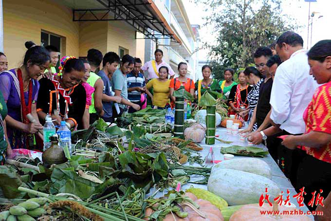 尚立文向記者介紹說(shuō):“以前景頗族過(guò)年,大年三十,一部分男人在家殺年豬,其余的就上山打獵。景頗族很慷慨,凡是獲取到的獵物,見(jiàn)者都有份。女人除了在家準(zhǔn)備年夜飯,也會(huì)上山或下壩子采野菜等。但不管是打獵的還是摘野菜的,都必須在太陽(yáng)落山前到家,闔家歡度春節(jié)吃年夜飯?,F(xiàn)在生活好了,不打獵不摘野菜了,但還是得遵循太陽(yáng)落山之前到家的習(xí)俗?!?/p>