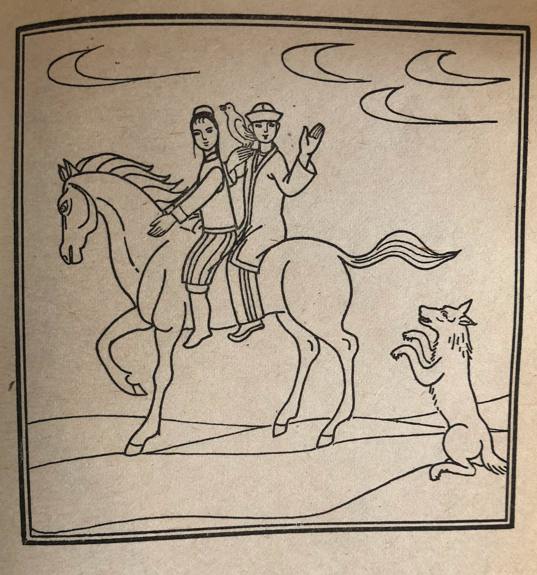 狼說了聲:“現(xiàn)在我該走啦?!鞭D(zhuǎn)身就走了。清晨,汗的姑娘讓四十個侍女領(lǐng)先,又讓四十個侍女隨后,她領(lǐng)著她們正要外出游逛去。狼藏在樹林后邊,上去一把把汗的姑娘拉住,很快地把她帶到了少年這里,讓讓他們倆一前一后地騎在自己背上,馱著他們飛馳而來。在路上,姑娘和這個少年彼此相愛了。少年向狼央求道:“現(xiàn)在我同這個姑娘已經(jīng)成了永遠也不能分離的一對了??墒牵趺礃硬拍懿环蛛x呢?請你給我們想個辦法好吧?”
