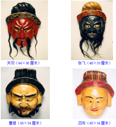 反映三國內(nèi)容的舞蹈有“五官”“三將”“五將”“關(guān)老爺”等內(nèi)容。面具角色有劉備、關(guān)羽、張飛、曹操、呂布等。表演動作疾緩有序,再現(xiàn)了三國時驍將馳騁疆場的場面。