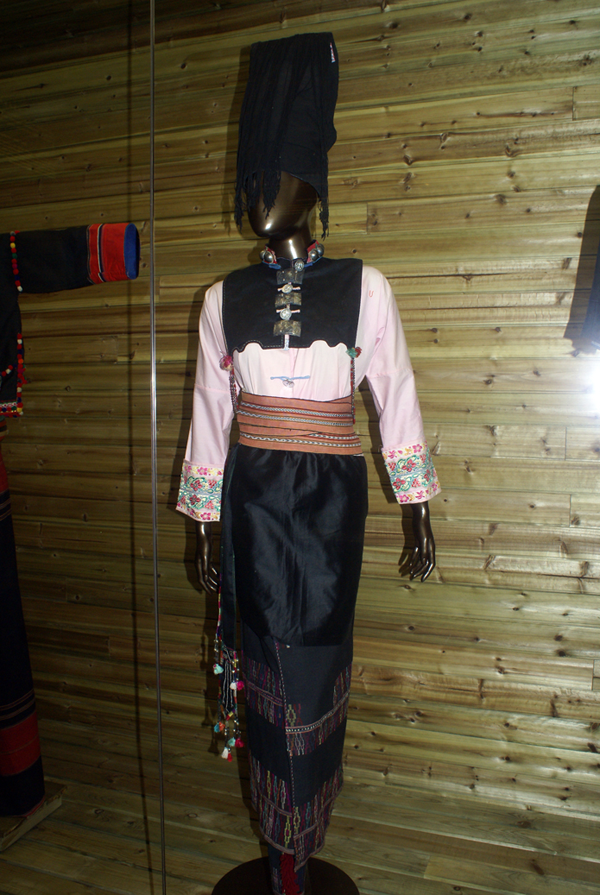 男子穿對襟上衣,下著黑褲,斜背“筒帕”,喜歡在胸前戴朵紅絲線結(jié)成的菊花。未婚男子戴白包頭,已婚男子戴藏青色包頭,青壯年在腦后留一尺多長的包布,有隨身佩帶刀的習(xí)俗,其中“戶撒刀”最為有名。