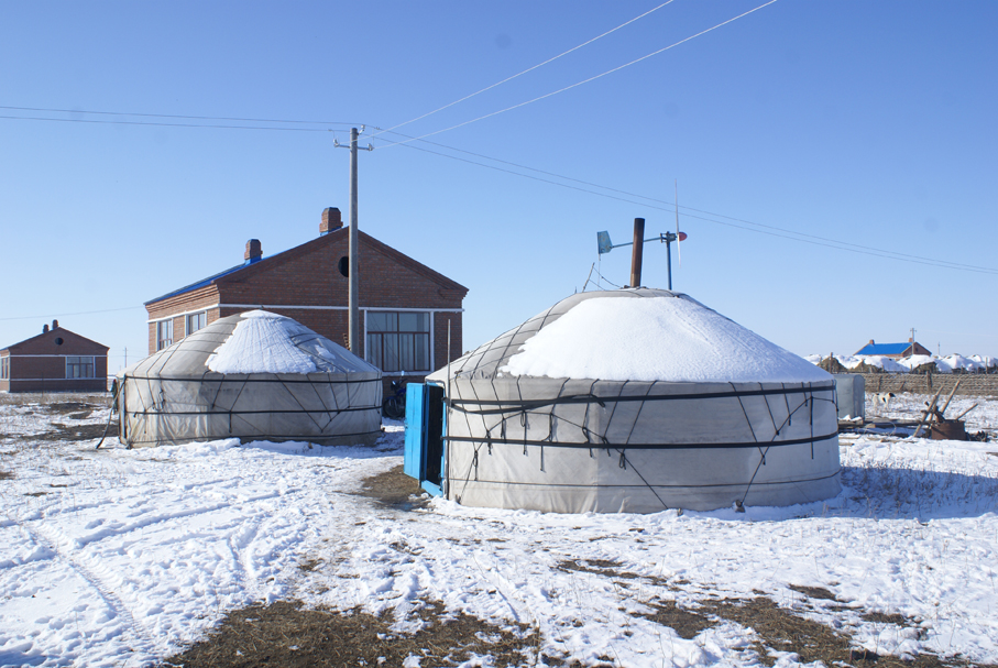 牧區(qū)主要的住房是“蒙古包”,鄂溫克人稱住房為“糾”,分別有“奧布海糾”和“俄儒格糾”。前者是一種形式簡陋的蒙古包式的住房,一般為打獵、拉腳、打羊草時的臨時住房,或為經濟困難人家迫不得已時所居住。建造“奧布海糾”需要二三十根榆木桿子,頂端用繩子結在一起,下端插進地里形成“糾”的架,用葦子搭蓋出呈傘狀的棚房。這種房早期沒有定形的門,一般向南開一小口出入,僅以葦捆及氈子作門。后來“奧布?!币惭b置頂孔,材料是榆木和柳木,鑿出現代蒙古包的包頂。圓頂的邊緣上鉆有小孔,以便插進木桿,成錐形。同時用葦子搭蓋成屋,冬季門里掛上一層氈子防寒?!岸砣甯窦m”也就是現在所稱的“蒙古包”,因為圓孔屋頂而得名。蒙古包的木架是用上、中、下三節(jié)結構組成而成,外面的擋簾根據季節(jié)不同而樣式不同,夏季采用柳條串成簾圍在包外,用蘆葦串成傘形簾,蓋在上面擋雨。冬季則用帆布外加氈子圍嚴,以保包內溫度,近年冬季在包內床下搭熱炕。蒙古包一般選在陽坡、地勢較高、用水方便、靠近牧場的地方搭蓋。在搭蓋蒙古包時,雨季要搭得斜度大些,以防漏雨;冬季為免受強風吹襲,則搭建的斜度小。蒙古包內置有床、爐子,有木箱柜、桌子等用具。近年來,隨著經濟的發(fā)展,住土房、磚房的越來越多。值得一提的是鄂溫克族的牧民雖無固定住所,卻有固定建筑,那就是他們的倉庫。鄂溫克族的倉庫極為奇特:先砍去相鄰兩棵大樹的樹梢,作為柱子,然后用木頭壘出一間懸空的倉庫,地上斜豎一根砍有階梯的木柱為梯。倉庫中存放食品、獵物、衣服、用具等。牧民從不上鎖,其他獵人可任意取用,事后如數歸還即可。
