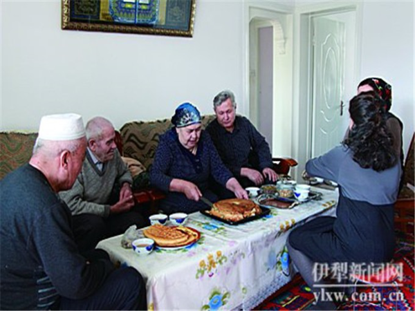 整個制作過程,兩個老人有一搭沒一搭地聊著天,準備食材,互相搭把著手。屋外客廳里,她們的丈夫一邊看著電視一邊等,其樂融融,倒讓人感覺到一種歲月靜好的美感。待屋子里到處都飄蕩著拜列西濃烈誘人的香味時,大家的味蕾都被調(diào)動起來。就在這當兒,買斯胡旦的弟弟帶著弟媳也來了。兩口子熱鬧,一開門,爽朗的笑聲就飄進門。弟媳說:“嗨,我這兩個姐姐手可是巧得很!”弟弟說:“做了這么好吃的東西,沒人來吃怎么能成!”