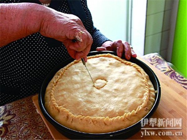 這段時間,就可以拌餡了。買斯胡旦向先前放在一旁的羊肉、土豆和洋蔥中加入一些鹽和黑胡椒粉,攪拌均勻。肉與黑胡椒粉相融的辛辣香味已經(jīng)開始漫溢。接著繼續(xù)揉面。將醒好的面分成大小兩塊。大的做底,小的做頂。待大小兩塊面都搟成圓形薄餅狀后,就將底子鋪在托盤底部,多出的部分緊緊扣合托盤邊緣。然后倒入餡料,鋪平,加蓋,將上下兩層面餅悉心捏合成好看的花邊。最后,在面餅中間掏個洞,切下的面團做成小壺蓋,再原位放到上面。壺蓋的作用在于等面餅烤至表層泛紅時,將其端出,取下壺蓋,加些許開水進去?!鞍萘形骱芎?,里面的料很多,要是水干了,就不容易熟?!辟I斯胡旦解釋。做完這一切,就可以將托盤放進烤箱了,調(diào)整烤箱至200℃的火力就夠,這樣,經(jīng)過2個小時的烘烤,外酥內(nèi)軟,香而不焦的拜列西就烤好了。