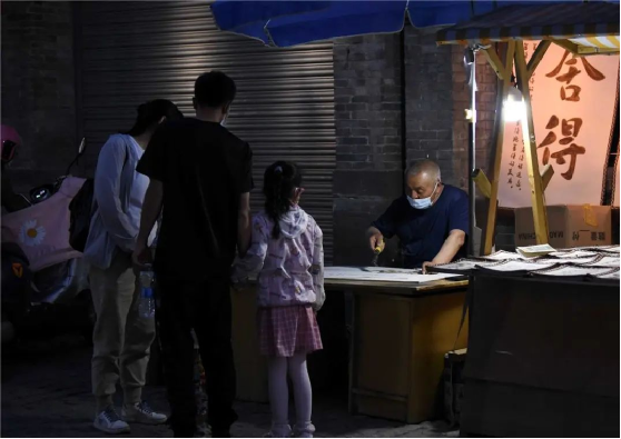 游客在呼和浩特市塞上老街欣賞非遺毛氈烙畫技藝。
