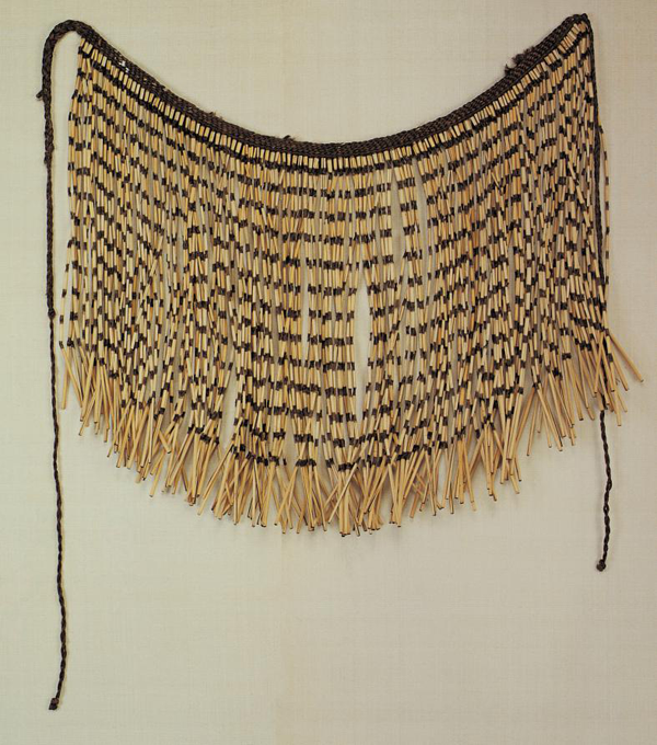 博嘎爾婦女穿一種叫“基都”的短上衣。用野麻織成的土布縫制,其樣式為無領(lǐng)、短袖、對(duì)襟。下部穿用羊毛織成的粗呢緊身筒裙,稱作“結(jié)邦”。小腿部扎裹腿,叫“涅蘇木”。條件好的人家外面還會(huì)罩一件稱為“階納布”的披肩。希蒙部落的婦女穿當(dāng)?shù)孛藁棾傻陌咨蛩{(lán)色的寬大對(duì)襟短上衣。下身穿筒裙,裙子下擺較寬,上面織有黃紅色或黃黑色的簡單圖案(圖為民國時(shí)期的珞巴族草裙,中央民族大學(xué)民族博物館館藏)。