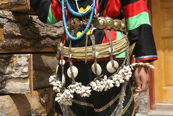 珞巴族男女都喜歡佩帶裝飾品,男子戴手鐲、竹管耳環(huán)、項(xiàng)鏈,腰間掛弓箭、長刀等物。婦女特別喜歡佩戴五顏六色的項(xiàng)珠,盛裝的婦女脖頸上有時(shí)戴十幾串到幾十串珠子,再加上手鐲、耳環(huán)、銅鈴、銀幣、鐵鏈、小刀、火鐮、海貝等飾物,有十幾斤重,可裝滿一個(gè)竹背筐,并被視為家庭財(cái)富多寡的標(biāo)志,不可缺少的嫁妝。