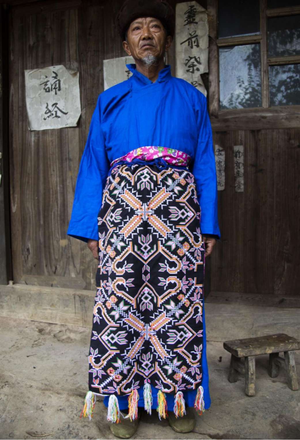 壩樓村苗族為花苗支,男子服飾比其他苗族支系的服飾更為艷麗,花紋圖案更多。男子服飾是一襲藍(lán)色的斜襟長衫,但在斜襟長衫腰部會系上長至腳踝的圍腰,圍腰以黑色為底色,上繡花紋和箭狀圖案,顏色以黃色為主。在圍腰下擺,連綴有絲縷。