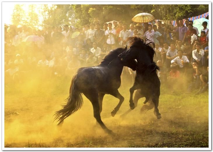 斗馬時(shí),先牽出一匹年輕母馬到場(chǎng)作媒介挑逗公馬,出場(chǎng)的兩匹公馬都想親近母馬,由此引發(fā)一場(chǎng)決斗。誰都想打敗對(duì)方而占有母馬,都使出渾身解數(shù),酣戰(zhàn)不止,直至決出勝負(fù)。