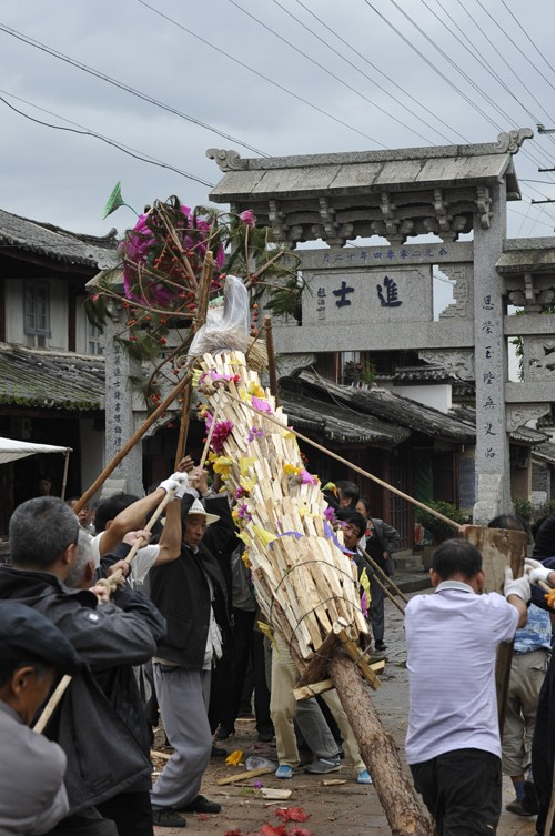 在劍川,都是由家里喜添子嗣的人家來籌備火把節(jié)的一切事宜,除了對新生兒的祝福,火把樹的裝扮也表示劍川人祈愿風(fēng)調(diào)雨順,人壽年豐、鄰里和諧。火把要扎十二層(閏年要扎十三層),上面六層的明子和柴分別由細到粗,一層接著一層,下面七層都是一樣的新柴。喻示每一個新的日子都紅紅火火。