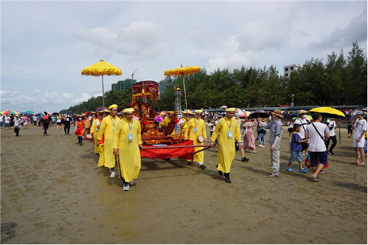 今年適逢中國共產(chǎn)黨成立100周年,活動(dòng)當(dāng)天,氵萬尾村洋溢著濃濃的愛國熱情?;顒?dòng)開始,身著京族服飾的當(dāng)?shù)卮迕駠墼谄鞐U前,舉行升國旗奏國歌儀式。隨后迎神隊(duì)伍在鑼鼓和鞭炮聲中到達(dá)海邊,將“海神”迎回哈亭敬奉,祈求人畜興旺,五谷豐登(見圖)。眾多慕名而來的區(qū)內(nèi)外游客集聚哈亭和海邊,與京族同胞一起歡慶這盛大的節(jié)日。