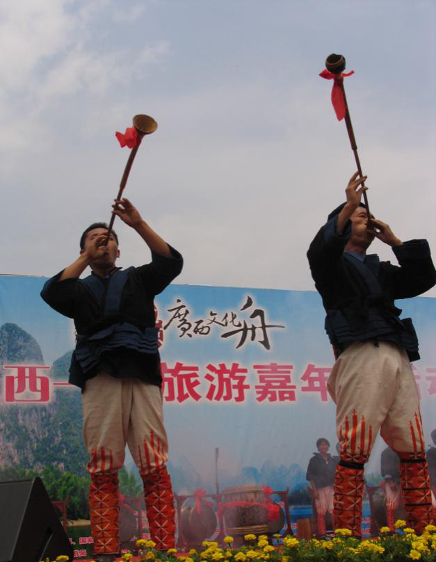 民間娛樂和日常祭祀用的樂器,有長(zhǎng)鼓(黃泥鼓)、銅鼓、嗩吶、洞簫、笛子、銅鈴、簡(jiǎn)板、長(zhǎng)號(hào)、牛角、銅鑼和皮鼓等。長(zhǎng)鼓、牛角、竹笛等樂器,在宋代的樂器中,已廣泛采用,是十分動(dòng)聽的一種樂奏。牛角,是瑤族特有的古老樂器,演奏時(shí)用以伴奏,其聲“鳴鳴”然,遠(yuǎn)近無不聽聞。長(zhǎng)號(hào)、銅鑼、鈸、二胡等樂器是外族傳入瑤區(qū)的,他們除了吸取外族演奏的技藝之外,根據(jù)自己的民族特點(diǎn),增添了不少的本民族生活色彩,演奏技巧更為高超,深受群眾歡迎。