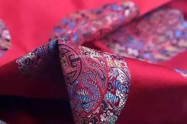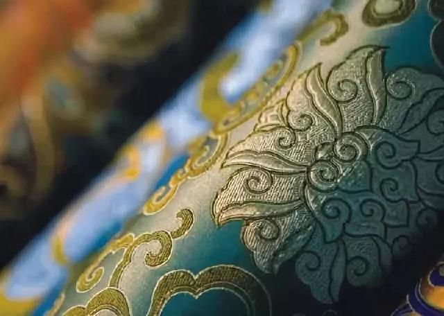 民族錦一般采用多色彩條嵌入金銀絲織成,多用于民族服飾,故名。其特點是錦面上的圖案從經(jīng)緯線交織中顯現(xiàn)出自然光彩,富有光澤。常見的圖案有團花、葵花、“萬”字“壽”字等。彩暈錦的特點是織紋華貴相映,明暗匹配,層次分明,并以色暈過渡,花紋絢麗多彩,別具一格。