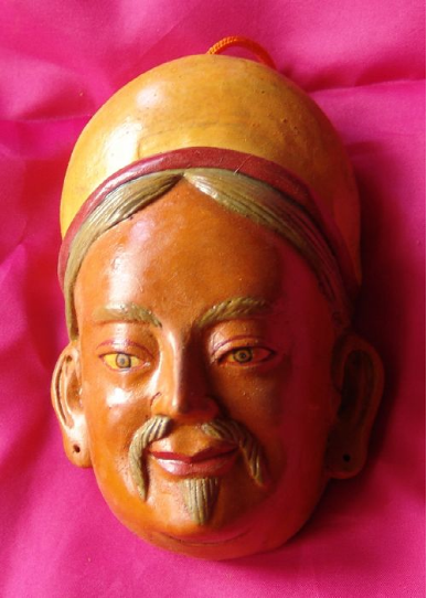 泥塑面具的制作也很有講究:“首先要將面具模型徹底風(fēng)干,然后在表面敷上摻有液體樹膠和面粉熬制而成的糨糊,再用一小塊布將風(fēng)干好的模子包好裹嚴(yán),接著要敷一層柴薪混合物,同樣用另一塊布把泥模包實(shí),反復(fù)四五次后,將模子放好讓它自然干透。這些步驟做完后,要用一根棍子敲打出包在里面的泥模,這樣就形成了布、樹、膠和面粉做成的一種面具。當(dāng)然,做好后還要進(jìn)行彩繪、涂清漆,這樣才能讓一個(gè)面具光彩奪目?!边叞驼f(shuō)道。