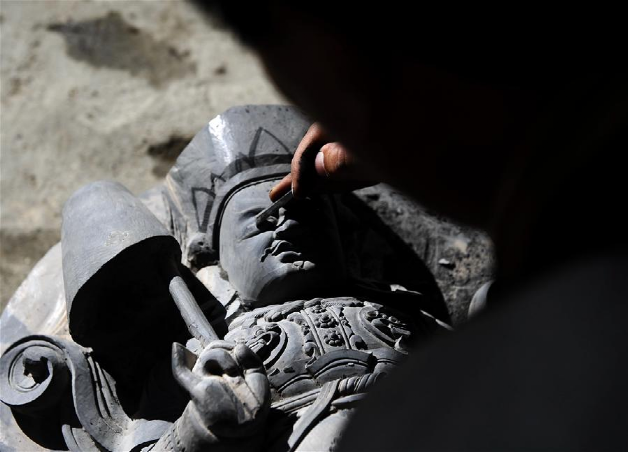 伴隨著收音機(jī)傳出的旋律,西藏自治區(qū)級黑玉石雕刻技藝非物質(zhì)文化遺產(chǎn)傳承人土登加措和他的徒弟們開始了又一天的黑玉石佛像雕刻工作。黑玉石產(chǎn)生于海拔4500米以上的石山上,是高原特有的一種石材。據(jù)古書記載,西藏第一代藏王聶赤贊普曾將天降的經(jīng)書、塔模等佛教圣物封存于洞中,并以黑玉石雕刻佛塔做蓋,于是便有了西藏歷史上有記載的第一件黑玉石雕刻作品。作為這門技藝的第五代傳人,土登加措延續(xù)著家族的技藝,一直傳承著這門古老的技藝。西藏黑玉石雕刻技藝在2012年入選第四批西藏自治區(qū)級非物質(zhì)文化遺產(chǎn)名錄,土登加措如今已有近30名弟子,古老的黑玉石雕刻技藝正在慢慢走向世界。新華社記者 晉美多吉 攝