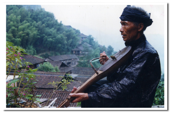 果哈是苗族唯一的古老的民間弓弦樂器,因其形似瓢,故苗語稱之為果哈(意即瓢琴),是唱古歌時(shí)不可缺少的伴奏樂器,一般以歌師自拉自唱為主。制作工藝比較粗糙,先選一段長(zhǎng)60厘米、直徑為15厘米左右的鴨腳木或泡桐木制成琴身,在其二分之一的一端剜成瓢狀,封住薄板作共鳴箱。另一端修成琴柄,在琴柄頂端鉆孔安琴鈕,用棕繩、牛筋作琴弦,用竹片和綜絲制成弓。琴置兩弦,演奏時(shí)以人的唾液代替松香,演奏者時(shí)而將弓毛放入口中,讓弓毛增加溫度,增強(qiáng)與琴弦的磨擦,使之發(fā)音。果哈音量微弱,發(fā)音低沉,但音色獨(dú)特,與苗歌語調(diào)相當(dāng)協(xié)調(diào),較適合表現(xiàn)安靜、深沉情緒,故常為苗族敘事古歌伴奏。