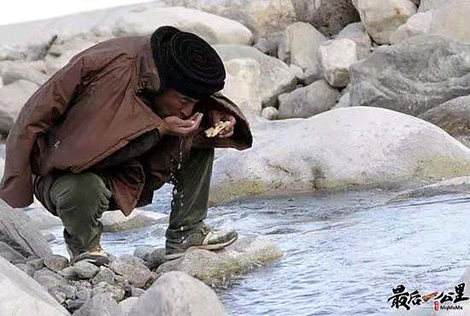 在巡邏間歇,拉齊尼·巴依卡喝著河水,吃著大馕,經(jīng)常如此。(網(wǎng)絡圖片)