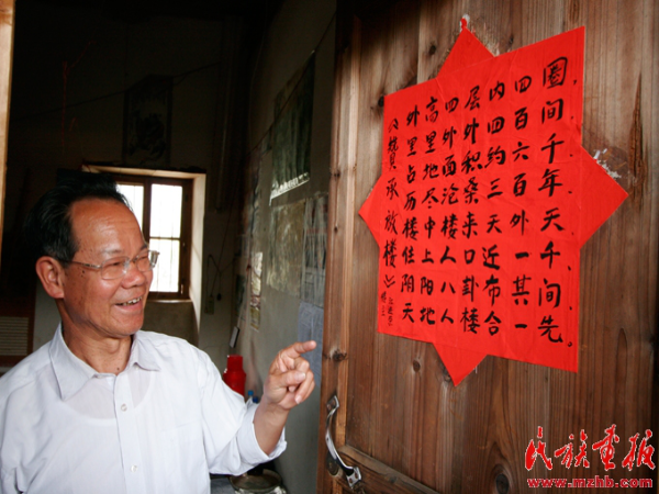 當(dāng)過小學(xué)老師的江進榮為游客介紹承啟樓,還專門寫了首詩
