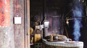 鏡頭的取景框內(nèi),青菜在“古井”潺潺流水中淌去泥沙,沿著苔蘚步道,裝在背簍里被送入小院;陽(yáng)光透過(guò)窗欞灑下,熏黑的灶臺(tái),柴火劈啪作響,趁著火候,幾下翻炒,白霧便混合著農(nóng)家飯香騰騰升起。