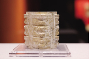 位于浙江杭州余杭區(qū)的良渚遺址,是考古實證中華文明史的典范。良渚文化玉器發(fā)達(dá),玉琮和玉璧是其重要代表。展覽中的這件玉琮出土于反山遺址12號墓,內(nèi)圓外方,器型規(guī)整,共有三節(jié),雕刻簡化的神人獸面紋,紋飾類似后世青銅器“三層花紋”,制作工藝已使用拉絲、管鉆、鋸切等技術(shù),減地淺浮雕手法,滿密的陰線刻,精細(xì)的器表打磨剖光技術(shù),均表現(xiàn)了良渚玉器的高度成就。
