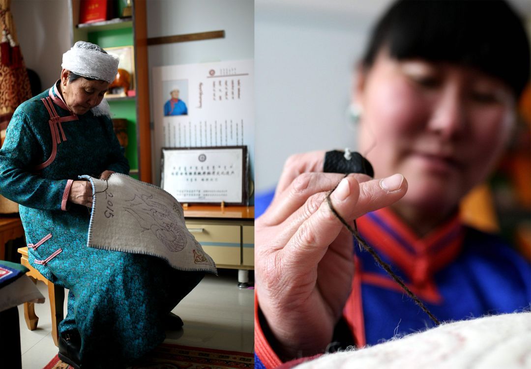 蒙古包穹頂?shù)絻?nèi)壁,從門簾到地上鋪的毛氈,從日常家居的蓋布到商旅使用的茶鹽袋,蒙古族人將細(xì)膩的各式花樣運(yùn)用在食衣住行的各個方面。而這些精美絕倫的裝飾都有一個共同的名字,那就是蒙古族氈繡技藝。