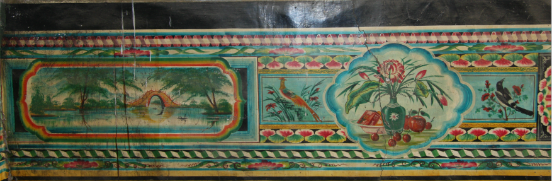 達拉特旗地區(qū)的墻圍畫高度一般在70厘米左右,其長度則依炕的大小而定??簧喜糠值漠嬍侵黧w,在結構上有一套固定的模式,即以上下兩組邊道,按照一定的規(guī)格布置形成主體框架,中間等距離安排各種畫空,既具完整對稱的裝飾形式美感,又具簡繁對比、主從相映的豐富表現內涵。邊道圖案種類繁多,有折子邊、卷帶邊、竹筒邊、花邊等。畫空也稱“池子”,有正方形、長方形、扇形、圓形等多種形式。此外,在下邊道與炕距離25-30厘米的范圍內是黃顏色的邊子,這樣的設計是避免炕上物件的遮擋和抬高人的視線,便于觀賞。