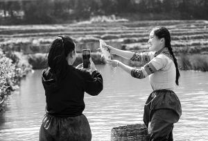 云南紅河哈尼稻作梯田系統(tǒng)被認(rèn)定為全球重要農(nóng)業(yè)文化遺產(chǎn)。圖為當(dāng)?shù)卮迕裨谔萏锱灾辈プヴ~。 陳欣波攝