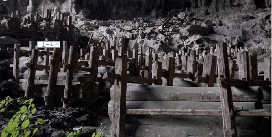 果里巖洞葬位于貴州龍里縣擺省鄉(xiāng)果里村東1公里煤洞坡的洞穴中,地處巖溶山原,峰叢林立,喬灌間雜。該洞在山頂下四十米處呈南北向橫穿山體,長580米,寬為38—65米,高為21—50米,有兩個入口;北面入口,寬54米,高21米,;南面入口,寬35米,高45米,有三道石砌墻垣。洞中地勢內(nèi)斜平緩,洞內(nèi)干燥,能見度好,入口處地勢外斜。據(jù)查,果里的苗族于明朝初期從貴陽遷徙而來。從遷徙之初至清末,他們均習慣將亡者殮于棺木集中存放在洞穴之內(nèi)。在洞穴北面入口3000平方米的范圍內(nèi)現(xiàn)存完好的棺木有192具,腐朽散落及其它原因損毀的約200余具。棺木材質(zhì)為杉木。棺木有平板平頭和鼓型雄頭之分,其大小因亡者的體型而定。平板平頭型棺木制作粗糙,長1.45—2.23米,寬0.46—0.75米,高0.46——0.9米;鼓型雄頭棺木多為杉木本色,長1.5—2.23米,寬0.48—0.8米,高0.5—0.9米。棺木一律頭向北面入口,均固定于兩個或三個“井”字架上;三個“井”字架表明亡者為男性,兩個“井”字架的為女性。棺內(nèi)亡者頭靠凹型木枕。平板平頭棺為明代,鼓型雄頭棺為清代。