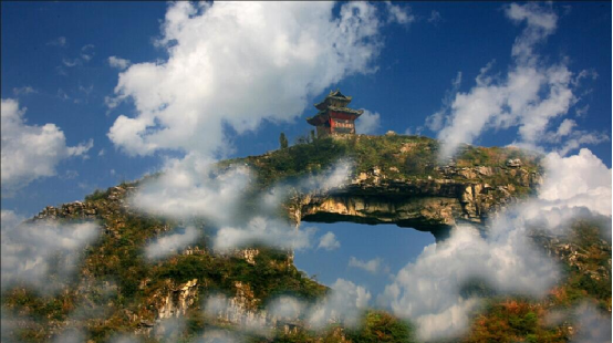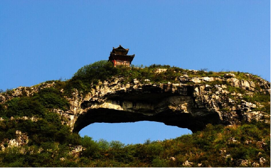 仙橋山位于貴州甕安縣城西南5公里的仙橋村,雄峙于南北伸展的長嶺之巔。山頂有一長方形穿洞,遠(yuǎn)望似一面中天明鏡,又若仕女發(fā)髻上的一匹玉簪。民間傳說,那高懸的“橋洞”,是神通廣大的仙人張三豐發(fā)怒時一拳擊穿的。站在“橋”下仰望“橋”頂,如巨粱橫亙天際,青崖黛壁,輝映云天。天衣無縫的“橋身”和兩邊的“橋墩”,渾然一體,構(gòu)成跨度約40米,寬20米,高約35米的“橋拱”。“橋拱”北面的“橋墩”腳有形狀各異的石洞,曲徑相通。洞壁有形似人腳印石凹,傳說是仙人張三豐到此云游留下的足跡。