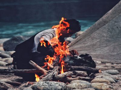 在河邊扎營的放映員
